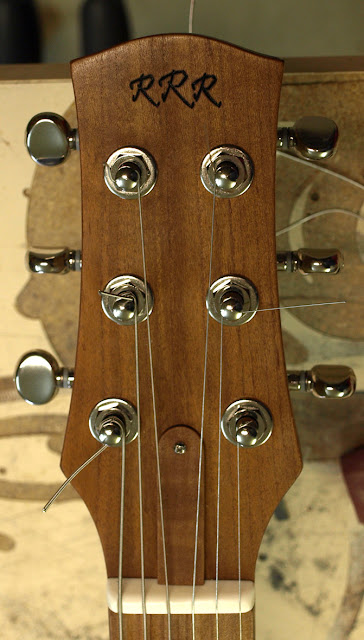 Et après l'érosion du corps, le ponçage final, la teinte, l'huilage, j'ai fait le sillet, le montage de l'accastillage et le réglage complet de la guitare en compagnie de son heureux propriétaire sur une journée. L'avantage c'est que Clément est le premier à jouer la guitare sa créer des liens, il ressent ce frisson spécial du premier jeu de cordes, découvre le timbre de l'instrument, il me voit affiner le réglage, mettre mon attention et mon savoir faire en action sur mille petits détails et surtout il repart avec son instrument et ça c'est la classe !!!
